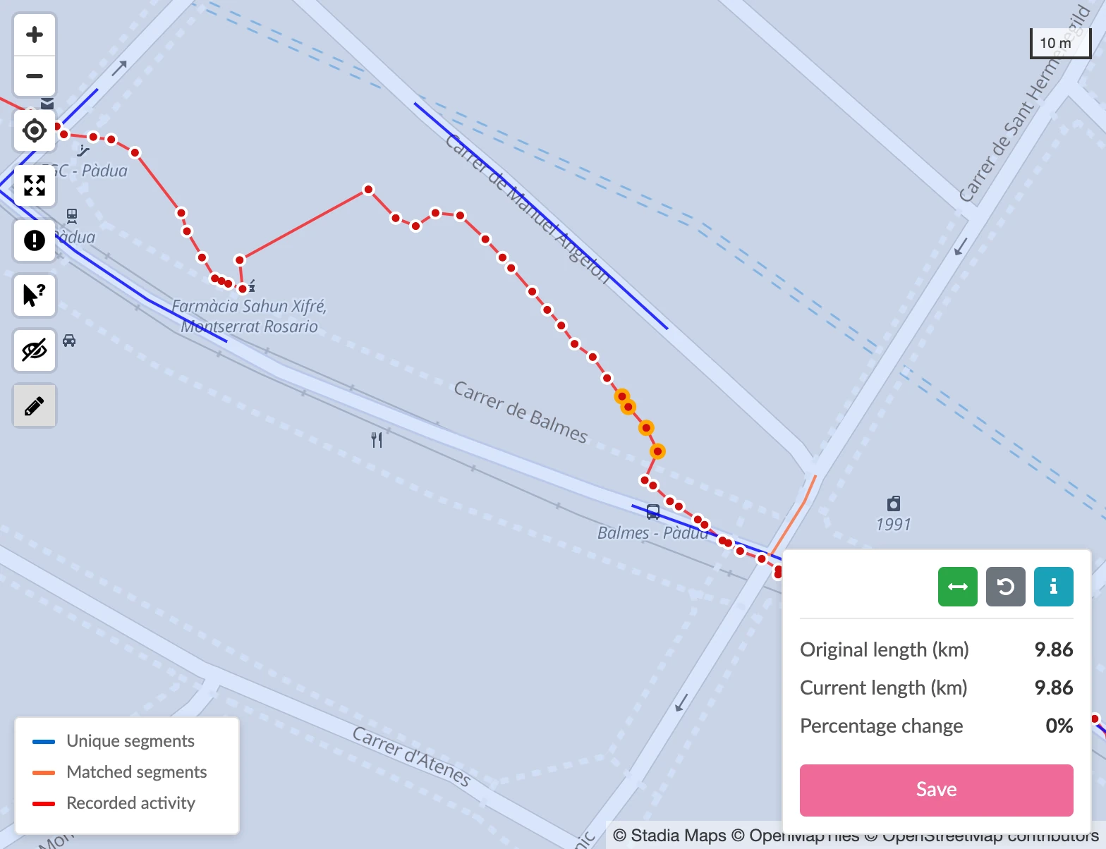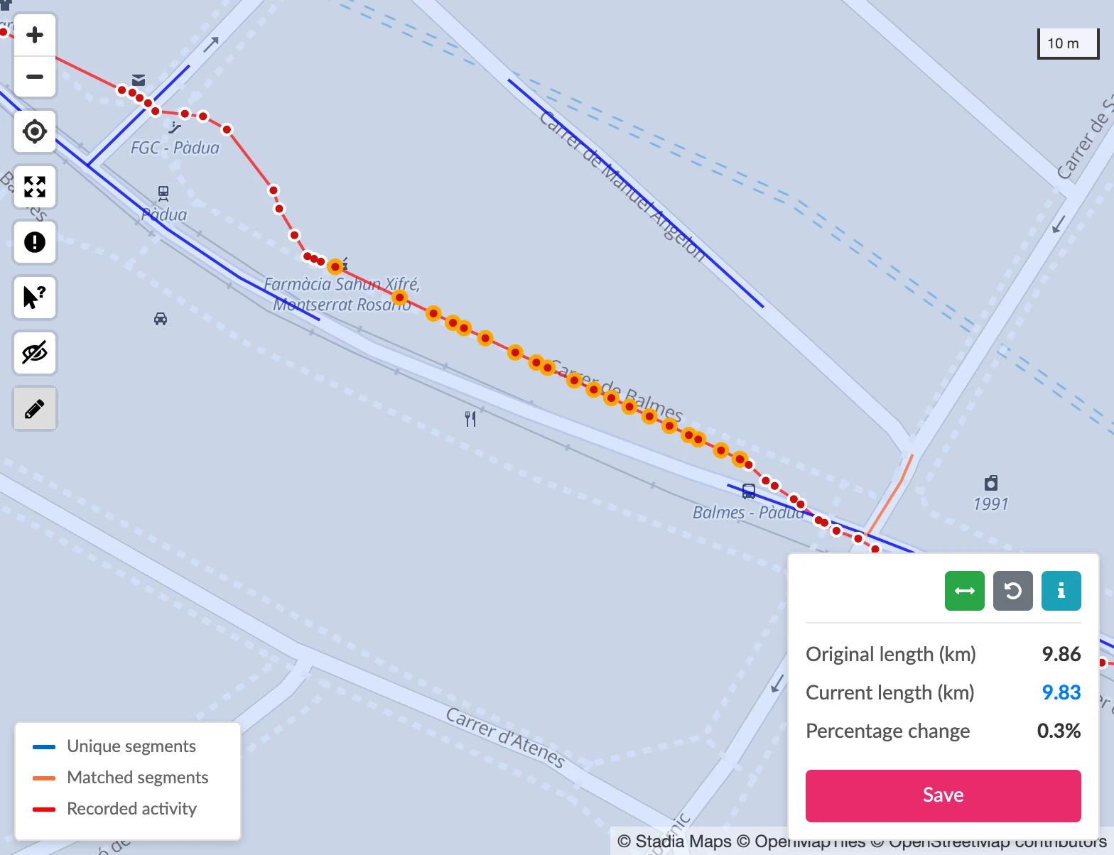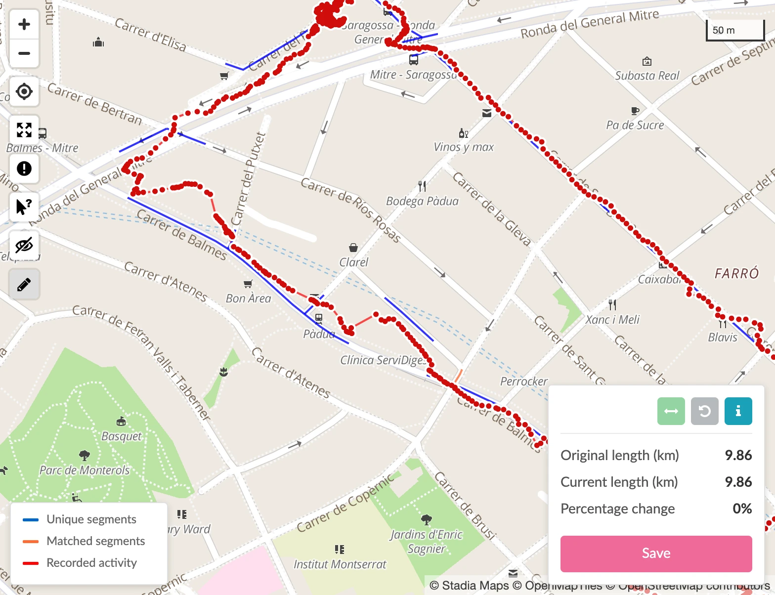 Rather than spend a lot of time perfecting Wandrer’s matching algorithm (which, to be clear, I have also tried, but is difficult for a variety of reasons), here’s a simple solution: let you edit the activity trace so that it falls in the correct place. It’d be great if the algorithm were able to get this right the first time around, but as a fallback, tweaking the activity seems a lot easier than having to go back out to the area in question and travel it again.