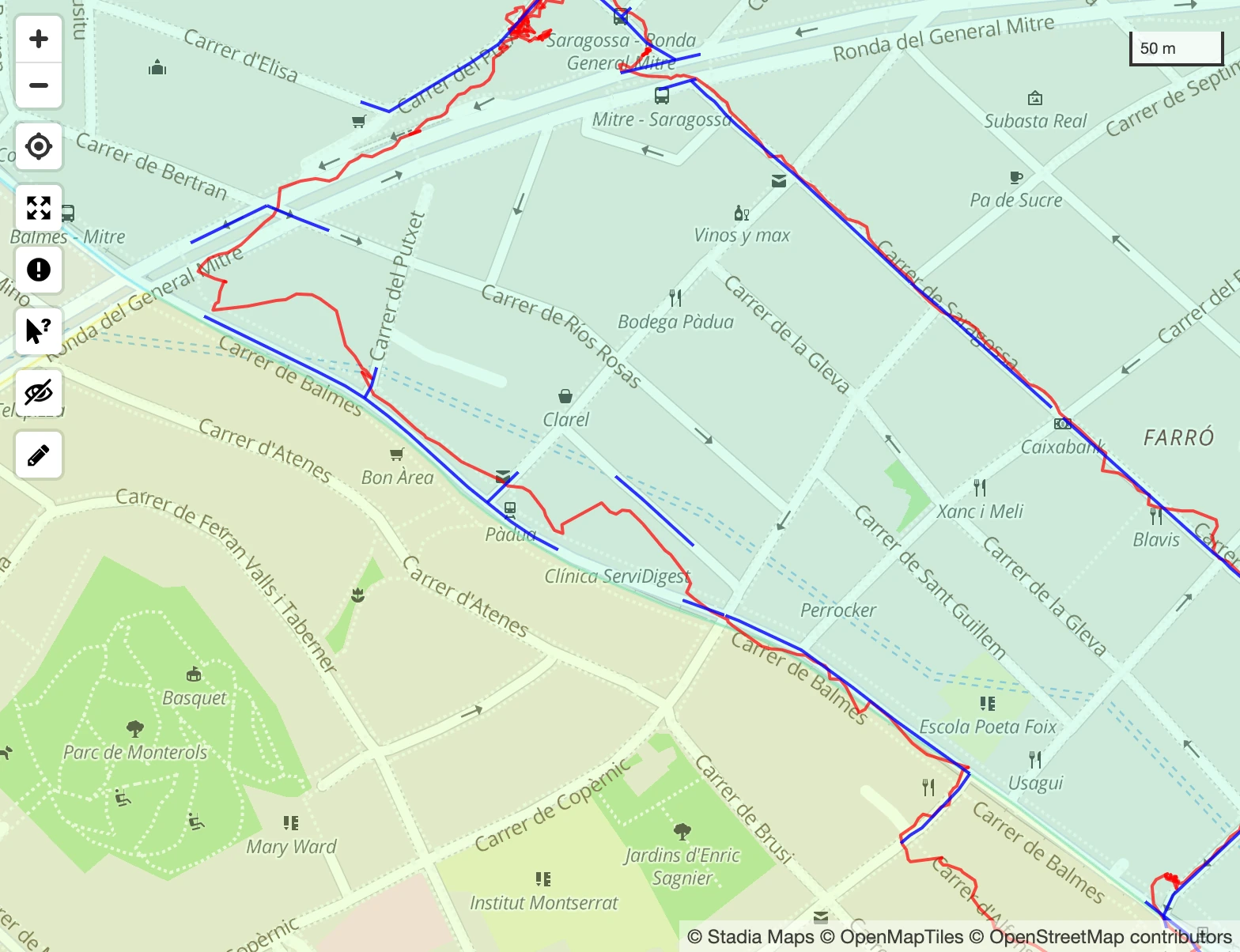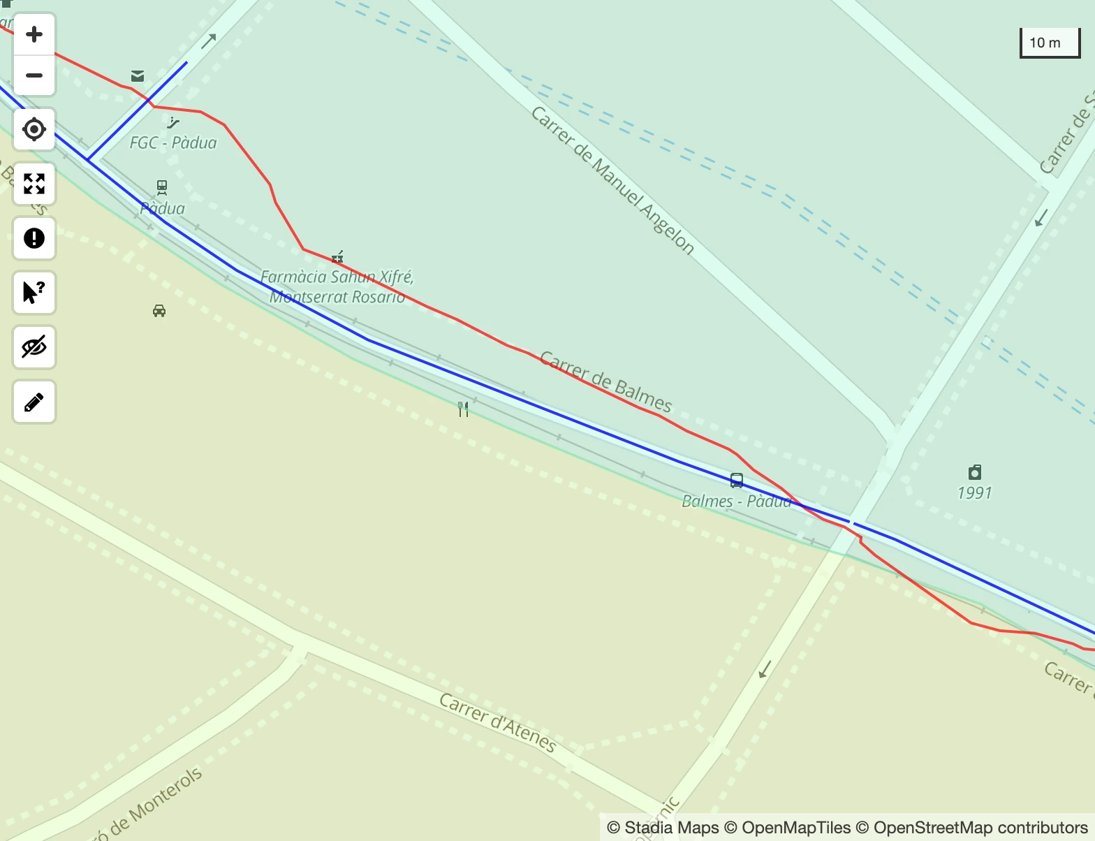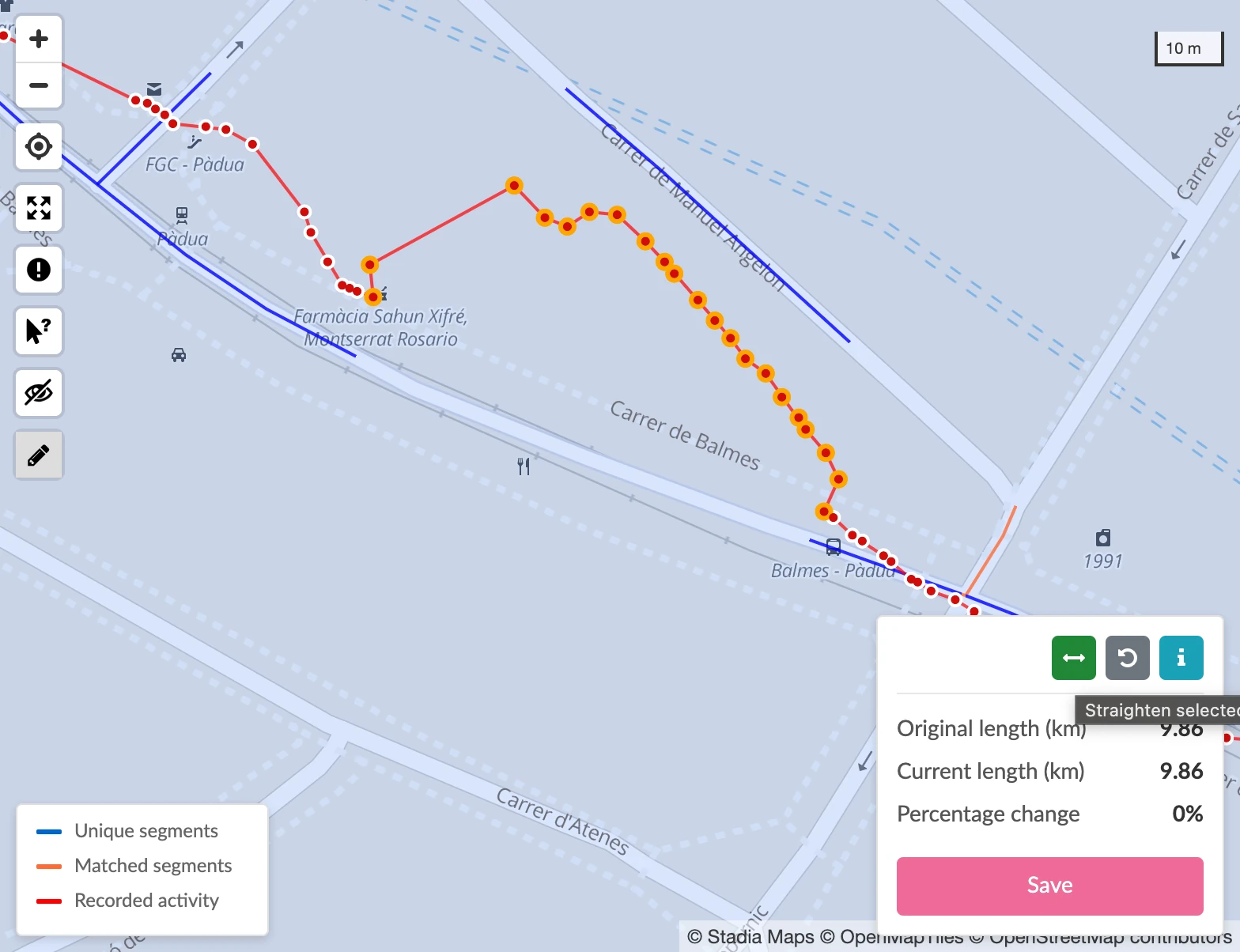 Rather than spend a lot of time perfecting Wandrer’s matching algorithm (which, to be clear, I have also tried, but is difficult for a variety of reasons), here’s a simple solution: let you edit the activity trace so that it falls in the correct place. It’d be great if the algorithm were able to get this right the first time around, but as a fallback, tweaking the activity seems a lot easier than having to go back out to the area in question and travel it again.